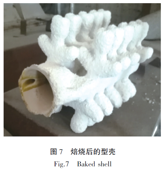 樹(shù)脂模在焙燒過(guò)程中容易發(fā)生膨脹脹裂型殼,本工藝樹(shù)脂模因其表面涂有蠟,預(yù)熱溫度60℃時(shí)蠟已經(jīng)開(kāi)始融化,使模型與殼之間產(chǎn)生了間隙,徹底解決了因樹(shù)脂焙燒膨脹而對(duì)模殼產(chǎn)生的脹裂問(wèn)題。樹(shù)脂模必須采用天然氣爐焙燒,樹(shù)脂在天然氣爐中瞬間燃燒消失減少了其因膨脹而對(duì)型殼損壞。圖6 為天然氣焙燒爐,圖7 為焙燒后的型殼。制好的的型殼組盤(pán)后即可澆注,澆注好的鑄件如果是重量輕、壁厚薄的鑄件其表面污染層薄,無(wú)需專門去除,經(jīng)過(guò)熱等靜壓、精整和包裝后即可發(fā)給客戶。
