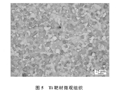 通常鈦靶材為多晶結構,晶粒大小可由微米到毫米量級,細小尺寸晶粒靶的濺射速率要比粗晶粒靶快,在濺射面晶粒尺寸相差較小的靶,濺射沉積薄膜的厚度分布也較均勻。研究發現,若將鈦靶的晶粒尺寸控制在100μm以下,且晶粒大小的變化保持在20%以內,其濺射所得薄膜的質量可得到大幅度改善(圖5)。集成電路用鈦靶材平均晶粒尺寸一般要求在30μm以內,超細晶鈦靶材平均晶粒尺寸在10μm以下。